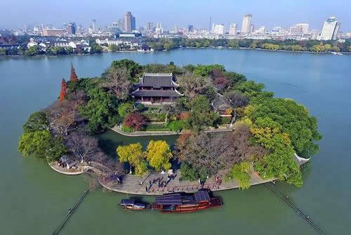湖心島位于南湖中心,全島面積17畝。明嘉靖二十七年(公元1548年)嘉興知府趙瀛組織疏浚城河,將淤泥壘土成島,次年移建煙雨樓于島上。清以后又相繼建建成清暉堂、孤云簃、小蓬萊、來許亭、鑒亭、寶梅亭、東和西御碑亭、訪蹤亭等建筑,形成了以煙雨樓為主體的古園林建筑群,亭臺(tái)樓閣、假山回廊、古樹碑刻,錯(cuò)落有致,是典型的江南園林。
