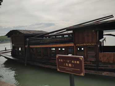停泊在煙雨樓前水面上的,是1959年仿制的一條當(dāng)年"一大"開會(huì)的游船,作為"一大"會(huì)議紀(jì)念船,它向人們生動(dòng)展現(xiàn)了中國共產(chǎn)黨誕生的歷史場景。這條“一大”紀(jì)念船被人們親切地稱為“南湖紅船”。這是一艘中型的單夾弄絲網(wǎng)船,船長16米,寬3米。內(nèi)有前艙,中艙,房艙和后艙,右邊有一條夾弄通道,中艙放一張八仙桌,周圍放桌凳和茶幾。當(dāng)年中共“一大”會(huì)議就是在中艙舉行。前艙搭有涼棚,房艙設(shè)有床榻,后艙置有櫥灶等物,船梢系有一條小拖梢船,為當(dāng)時(shí)接人進(jìn)城購物所用.。1921年7月23日,中國共產(chǎn)黨第一次全國代表大會(huì)在上海秘密召開。會(huì)議臨近結(jié)束時(shí),遭法租界巡捕的襲擾而被迫停會(huì),根據(jù)上海代表李達(dá)的夫人王會(huì)悟的建議,8月1日會(huì)議轉(zhuǎn)移到嘉興南湖的一條游船上繼續(xù)舉行。在這條紅船上,會(huì)議通過了第一個(gè)《中國共產(chǎn)黨章程》,宣告了中國共產(chǎn)黨的誕生,從此中國革命翻開了新的一頁。
