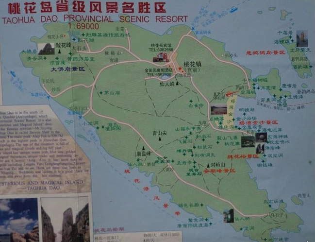 桃花島與——普陀山、“沙雕故鄉(xiāng)”——朱家尖、“十里漁港” ——沈家門組成普陀旅游金三角。 桃花島歷史悠久,宋乾道《四明國志》有證:客浦遺址考證,在商國時期就有人類活動的足跡。先秦,隱士安期生漂流至桃花島,采藥修道,開爐煉丹。嘗以醉墨灑于山石,遂呈桃花紋,奇形異狀,宛若天然,故石稱桃花石,山稱桃花山,島稱桃花島,被譽為“海上仙山”。桃花島擁有舟山千島第一高峰——安期峰,海拔539.7米;舟山第一深港——桃花港;東南沿海第一大石——大佛巖,巖體高 78米;舟山第二大沙灘——千步金沙;還是中國三大水仙名品之一的普陀水仙和浙江名茶之一的普陀佛茶的主要產(chǎn)地;又是浙江沿海島嶼中林木品種最多的島嶼,共有78科、556種,素有“海島植物園”之美譽。桃花島碧海金沙環(huán)繞、多奇峰怪石、林木蔥郁、氣候宜人、環(huán)境清幽、風(fēng)光旖旎,集山、海、沙、石、礁、巖、洞、花、林、鳥、寺、廟、庵、天象奇觀、軍事遺跡、歷史紀(jì)念地、摩崖石刻、神話傳說于一體,自然景觀與人文景觀相映成輝,相得益彰。大佛巖是桃花島的標(biāo)志,不但自然景觀獨特,而且蘊含著豐富的武俠文化內(nèi)涵,是金庸筆下《射》書中桃花島主黃藥師的主要活動場所。大佛巖中腹的“清音洞”是先秦安期生漂流到桃花島后的第一個居室,在《射》書中是黃藥師藏《九陰真經(jīng)》和關(guān)押老頑童周伯通的石窟。安期峰以峰、石為特色,寺、洞為主體,龍、道、佛三大文化為背景,具有山清、水曲、石趣、峰奇、境幽、氣爽的特點。安期峰是舟山群島獨一無二的風(fēng)景,古代詩人在此留下了不少名句。安期生選此仙境長時期在此隱居,學(xué)道煉丹,直至白發(fā)蒼蒼,人稱“千歲翁”,為后人留下了寶貴的文化遺產(chǎn)。位于桃花島東海岸的桃花峪,奇巖壁立,桃花峪龍珠灘上,有一顆直徑80厘米,重約500公斤的球形石被人們稱為“東海神珠”。每當(dāng)臺風(fēng)將臨時,海浪激飛散落,形成七彩長虹似龍騰躍,龍珠在龍喉里吞吐翻滾,發(fā)出隆隆回音,編織出一幅美妙神奇的“金龍吐珠”圖,被譽為“中華一絕”。形如拇指從掌中彈出,孤峰矗立、刀削斧劈、懸崖絕壁的彈指峰,是桃花龍女恩賜給桃花島鎮(zhèn)海擋風(fēng)的玉如意,也是金庸筆下桃花島主黃藥師練功習(xí)武之所。這里的海崖風(fēng)光可謂佳境。難怪600多年前元朝文學(xué)家吳萊到此游玩時寫詩贊曰:“……雕鎪鬼斧觖,刮濯龍湫移……”清代文學(xué)家朱緒來桃花島泛舟環(huán)游,寫下了《桃花山》和《桃花龍?zhí)丁吩,贊美桃花島風(fēng)光。在《桃花山》詩中還特別點出了觀環(huán)島景觀的感受,詩曰:“墨痕乘醉灑桃花,石上斑紋爛若霞。浪說武陵春色好,不曾來此泛仙槎!碧一◢u不但具有濃郁的漁鄉(xiāng)風(fēng)情和民俗文化,而且各代不少文人墨客、旅行家來桃花島觀光、探奇、尋古、考證,從先秦的安期生第一個上島之后,漢時的大臣李少純;宋時的文學(xué)家蘇軾;元朝文學(xué)家詩人吳萊;明朝的文學(xué)家、軍事家朱丸;清朝文學(xué)家、詩人朱緒、繆燧;直到當(dāng)代武俠文學(xué)大師金庸,每一位名人都留下了與實景相結(jié)合的作品。
