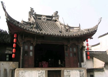 修真觀古戲臺(tái)是道觀的附屬建筑,建于清乾隆十四年(1749),與修真觀一樣屢遭毀損,但民國(guó)八年(1919)年修繕后,便一直保持至今。戲臺(tái)占地204平方米,北隔觀前街與修真觀相對(duì),南臨東市河,東倚興華橋。戲臺(tái)為歇山式屋頂,飛檐翹角,莊重中透著秀逸。梁柱之間的雀替均為精致的木雕,藝術(shù)價(jià)值極高。臺(tái)為兩層,底層用磚石圍砌 ,進(jìn)出有邊門和前門。邊門通河埠,底層后部有小梯通樓臺(tái),亦可通過(guò)翻板門從河埠下到船里。樓臺(tái)分前后兩部分,后部是化妝室,雕花矮窗,寬敞明亮;前部是戲臺(tái),正對(duì)廣場(chǎng)。
