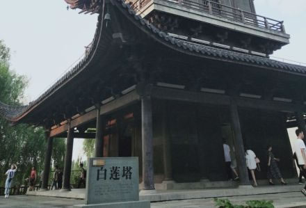 白蓮塔位于西柵大運(yùn)河畔的環(huán)河島上,白蓮塔高有七級(jí),塔高約51米,為烏鎮(zhèn)最高建筑,塔下有八角形的升蓮廣場(chǎng),廣場(chǎng)中有放生池,東側(cè)河岸邊有一條石舫。白蓮塔屬于宋元時(shí)期江浙一帶通行的磚木混合結(jié)構(gòu)的閣式塔,縱觀其塔,外觀呈梭狀,實(shí)際上塔的平面是呈正方形的,塔基也是一個(gè)24米乘24米的正方形,內(nèi)部地面用清水方磚鋪就而成。