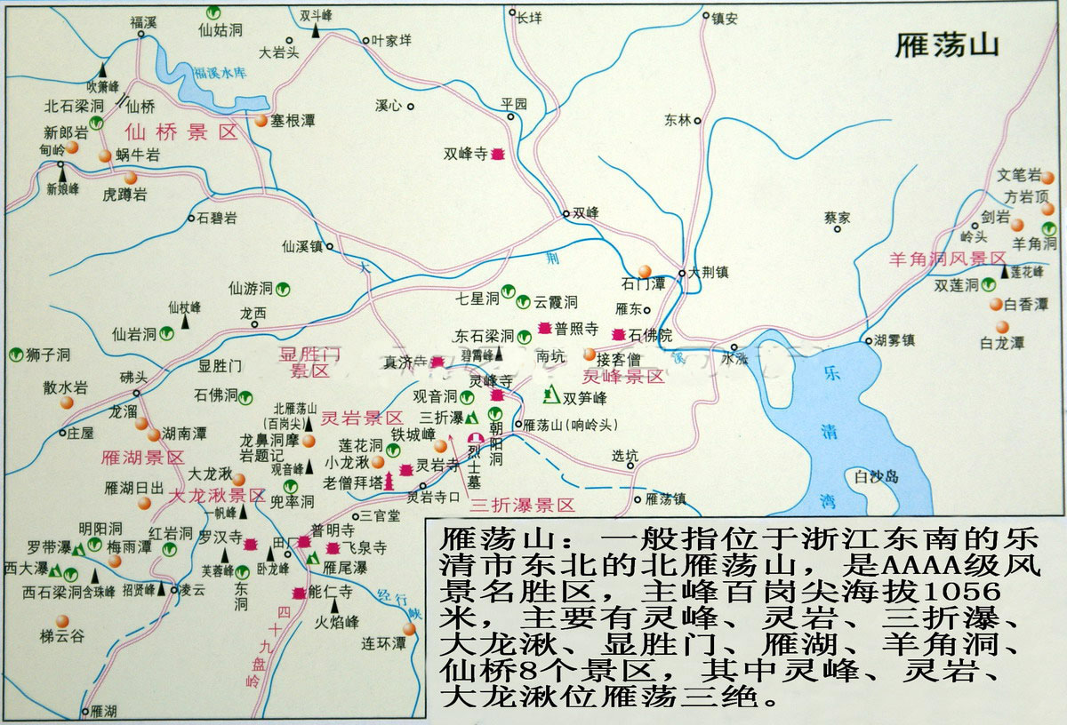 雁蕩山開發(fā)時(shí)間悠久,風(fēng)景資源豐富,人文景觀也頗具特色。據(jù)舊志書記載,計(jì)有十八古剎、十院、十六亭、一百零二峰、四十六洞、六十一巖、八谷、十四嶂、十嶺、十三溪、十七潭、十三瀑、七門、一橋、二湖、六坑、四水、四泉、二十六石等門類,此外還有一些不入門類的景點(diǎn)未統(tǒng)計(jì)在內(nèi)。根據(jù)地名普查所出的資料,與舊志書所載又略有不同,共計(jì)有景目五百五十多個(gè)。歷史上,人們根據(jù)山嶺走向把全山分為東外、東內(nèi)、西外、西內(nèi)四谷和南、北二閤六大景區(qū)。后來一方面因全山景區(qū)范圍的擴(kuò)大,另一方面根據(jù)游人腳步和景目分布范圍劃分為八大景區(qū),分別以各景區(qū)內(nèi)的主景點(diǎn)名稱命名為靈峰、靈巖、大龍湫、雁湖、顯勝門、仙橋和羊角洞景區(qū),其中大龍湫、雁湖、顯勝門、仙橋景區(qū)的的范圍與所屬舊名景區(qū)基本一樣,只有東內(nèi)谷和東外谷的景區(qū)劃分發(fā)生了很大的變化。一是東內(nèi)谷中分別以景點(diǎn)分布情況分設(shè)靈巖、三折瀑和靈峰三景區(qū);二是取消了東外谷景區(qū),將所屬范圍納入靈峰景區(qū);三是增設(shè)了羊角洞景區(qū),舊志書曾將區(qū)內(nèi)的雙蓮洞納入東外谷,事實(shí)上雙蓮洞所在地距東外谷約二十里之遙,因此需獨(dú)立設(shè)一景區(qū)。